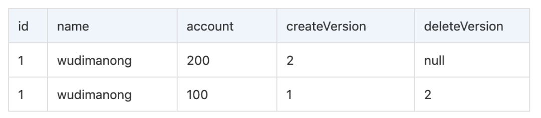只有符合上述两个条件的记录,才能返回作为查询的结果!以图中示范的逻辑为例,写请求将account变更为200的过程中,InnoDB会再插入一行新记录(account=200),并将当前系统版本号作为行创建版本号(createVersion=2),同时将当前系统版本号作为原来行的行删除版本号(deleteVersion=2),那么此时关于这条数据有两个版本的数据副本,具体如下: