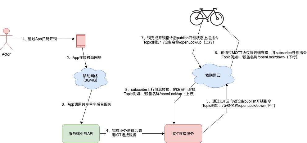 通过上面的基本描述,相信你对IOT及IOT中设备与服务端交互的MQTT协议已经有了一些认识,那么日常使用的共享单车IOT系统是如何设计的呢?通过一张图来解析,如下: