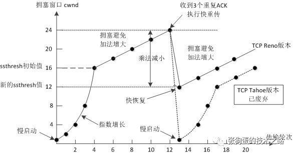 所以,TCP Reno算法进行了优化。当收到三个重复确认ACK时,TCP开启快速重传Fast Retransmit算法,而不用等到RTO超时再进行重传: