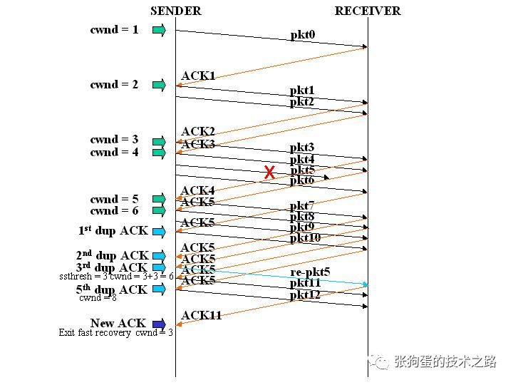 如图所示,第五个包发生了丢失,所以导致接收方接收到三次重复ACK,也就是ACK5。所以将ssthresh设置为当时cwnd的一半,也就是6/2 = 3,cwnd设置为3 + 3 = 6。然后重传第五个包。当收到新的ACK时,也就是ACK11,则退出快速恢复阶段,将cwnd重新设置为当前的ssthresh,也就是3,然后进入拥塞避免算法阶段。
