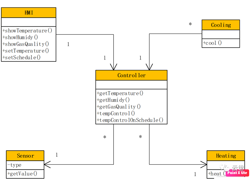 在该模型中,虽然客户没有提,但我们还是在中间画出了一个控制器,因为很显然,这里需要一个控制器将 HMI、传感器、加热设备与制冷设备串联起来。这时,客户非常认可我们对业务的理解。随后,我们在这个领域模型上进行了更深入的业务探讨,又绘制出了更加细化的领域模型: