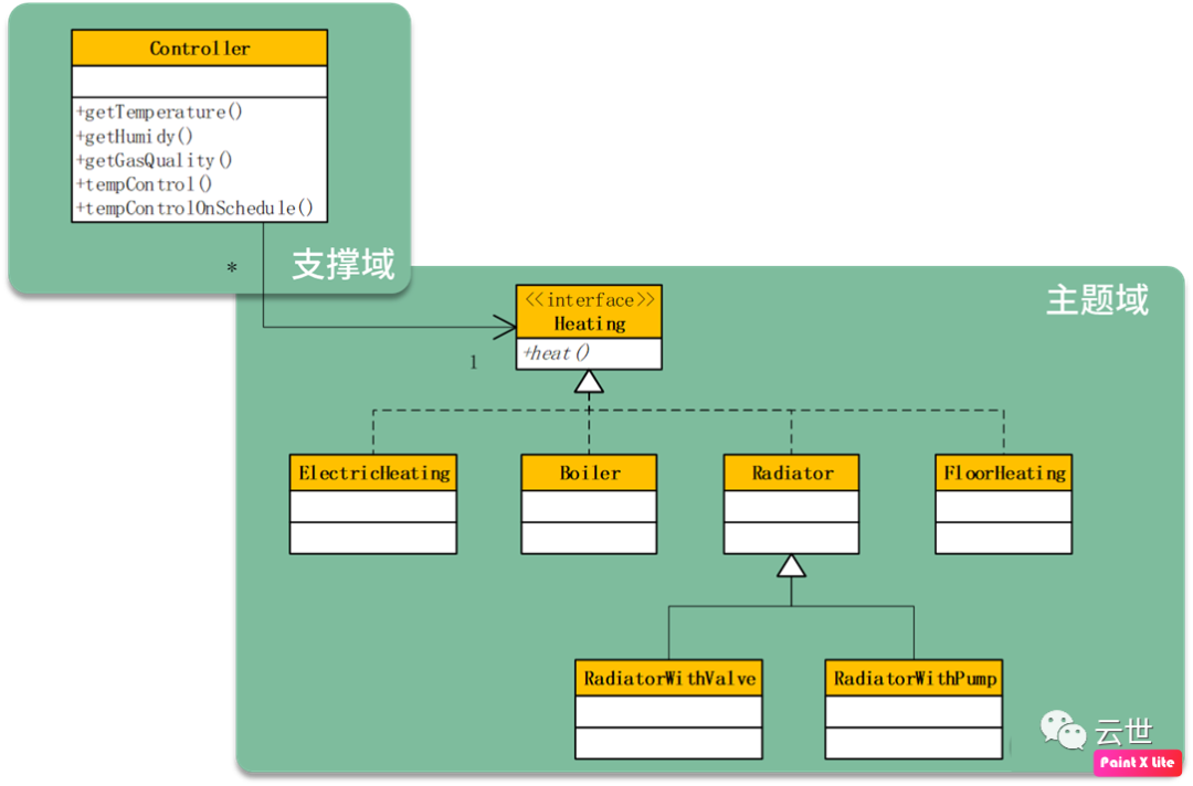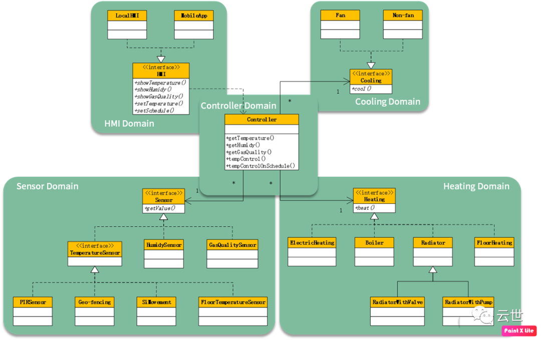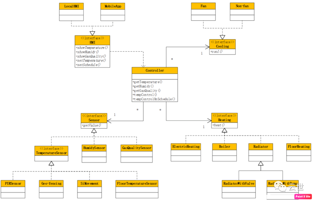 按照同样的思路,我们设计了加热设备、制冷设备,它们同样是在一个标准接口的基础上,有各种各样的不同实现。有了这样的领域建模,那么后面就在此基础上设计实现。有了这样接口的设计,就使得不同类型的传感器、加热设备、制冷设备,以统一的兼容接口,插拔式地组合使用,以适应用户各种各样的个性化需求。
