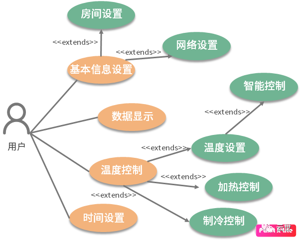 首先,我们与客户进行需求讨论。然后将返回的需求进行分析整理,将每个功能整理成用例模型,然后对每个用例模型编写用例描述,以这样的形式形成《用户需求规格说明书》。例如,在以上智能温控系统的需求规格书中,首先绘制用例模型: