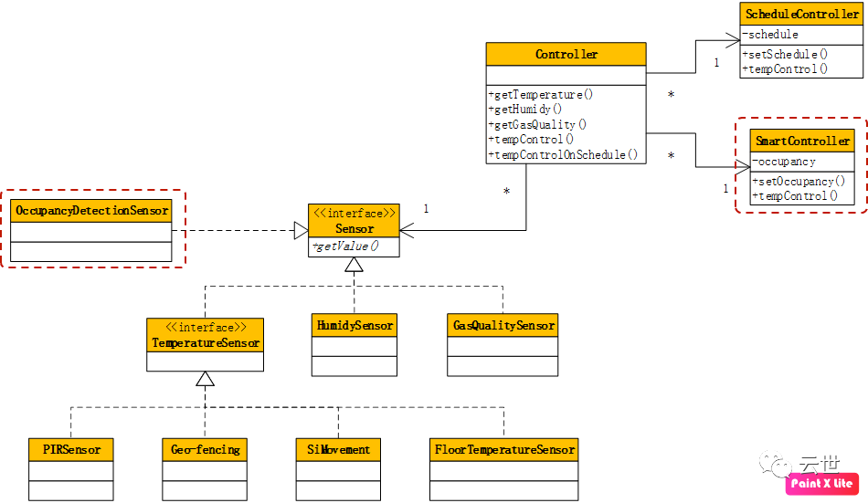 在对新需求的解读中,首先需要一个新的传感器——房间是否有人的传感器。接着,根据房间是否有人进行智能温度控制。这个温度控制的业务逻辑,显然与前面温度控制的业务逻辑,是软件变化的两个原因。因此,将智能控制从原有的控制器中剥离出来,单独形成了一个SmartController。