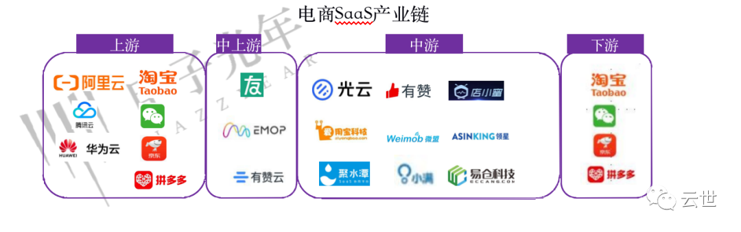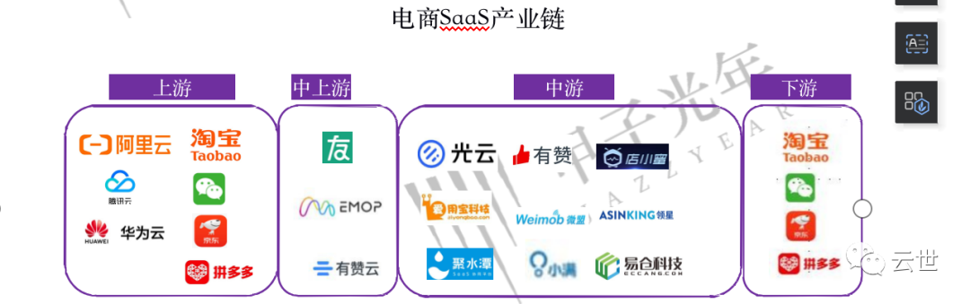 • 下游参与者主要是电商平台及各类电商商家,目前以电商服务市场、平台型卖家、跨境电商为主。2020年,直播电商的爆发、跨境电商快速增长及在线教育、在线零售等行业的发展为电商SaaS厂商提供了新的切入点。