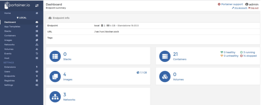 dashboard页面可以看到当前机器上容器的数据统计,4个镜像、21个容器、3个网络