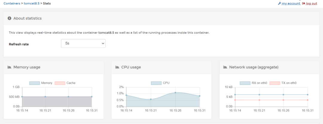 点击性能监控按钮,可以看到容器当前的性能信息,CPU、内存、网络等,再也不用担心性能监控了。