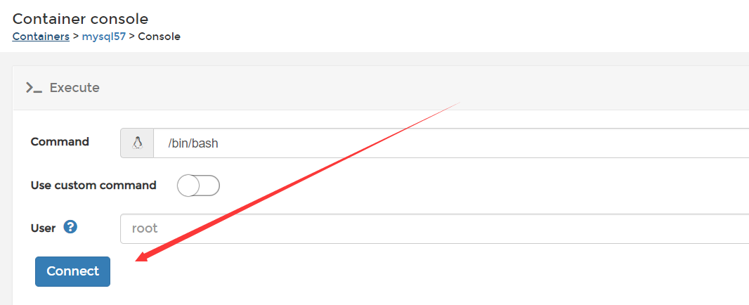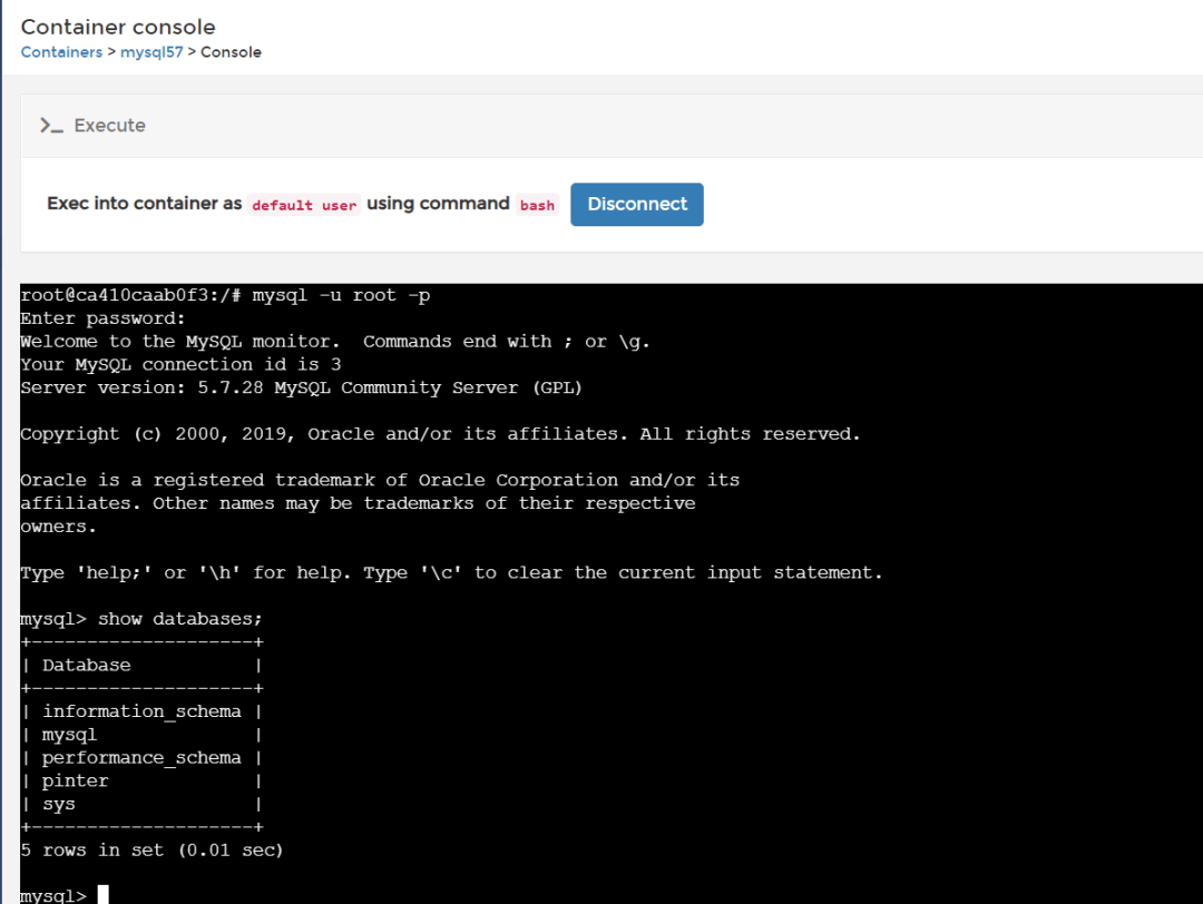 点击execute console按钮,可以进入到容器的命令行中,执行命令,比如进入到mysql容器执行命令。