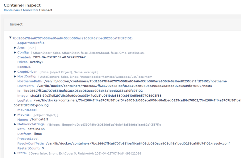 点击“Inspect”按钮,可以看到容器的基础信息,比如IP地址