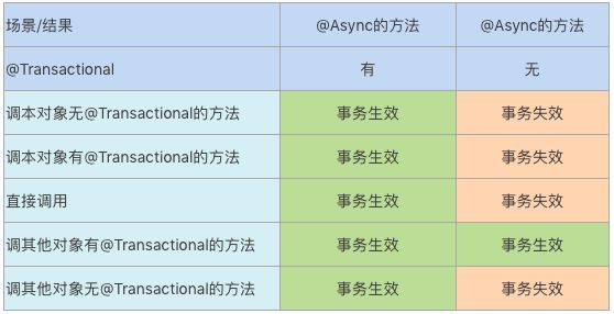 图中表示的是用@Async注解修饰的异步方法,在各种场景下的事务表现。