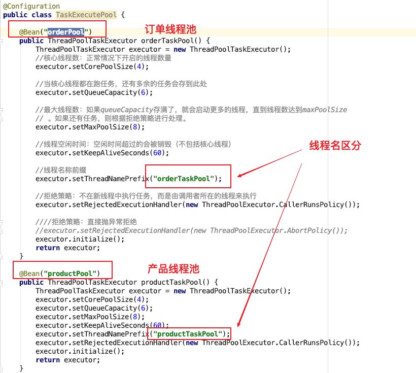 对不同的产品服务和订单服务,通过Bean的名字指定不同的线程池: