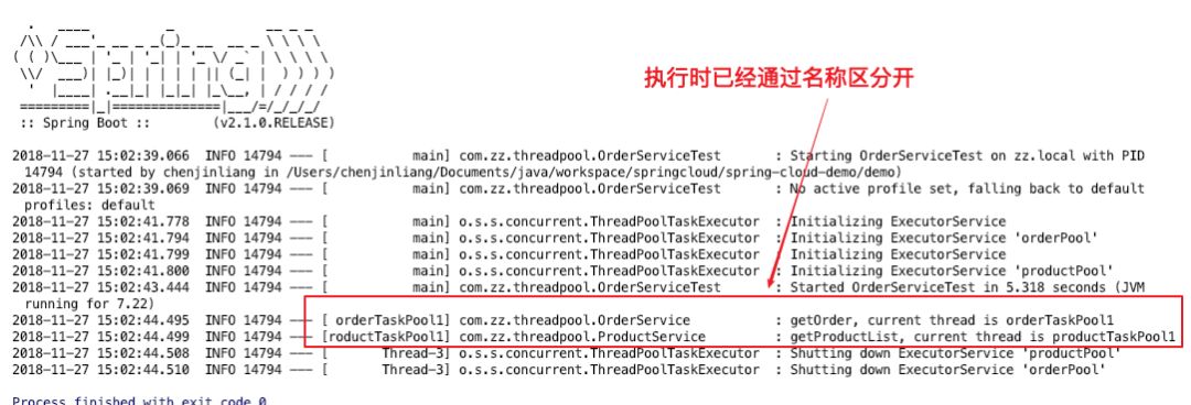 运行单元测试,可以看到指定的两个线程池已经发生了作用: