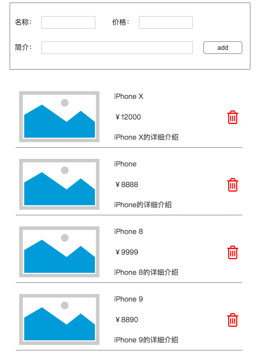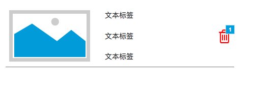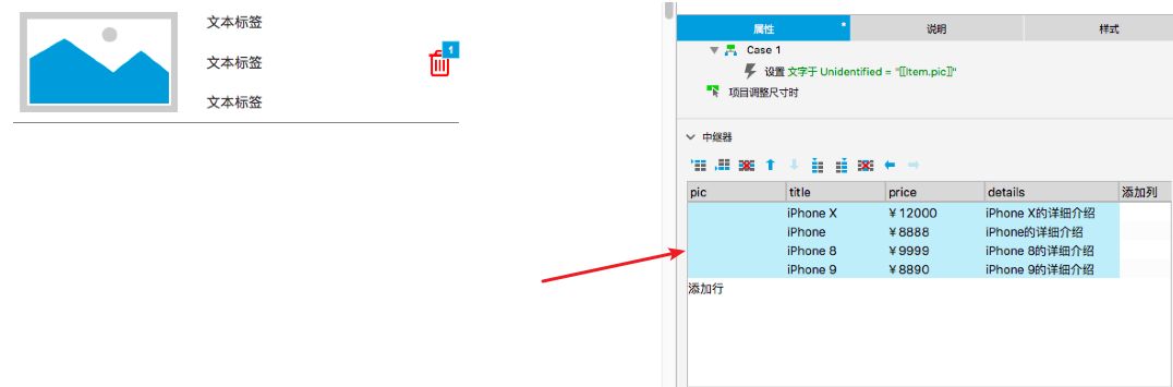 双击中继器,进入中继器编辑页面。删除默认的矩形,拖动添加如下元件(一个图片,三个文本标签,一个删除图标,一条横线)至页面上,排版。给图片、上中下文本标签分别命名为:pic,title,price,details。