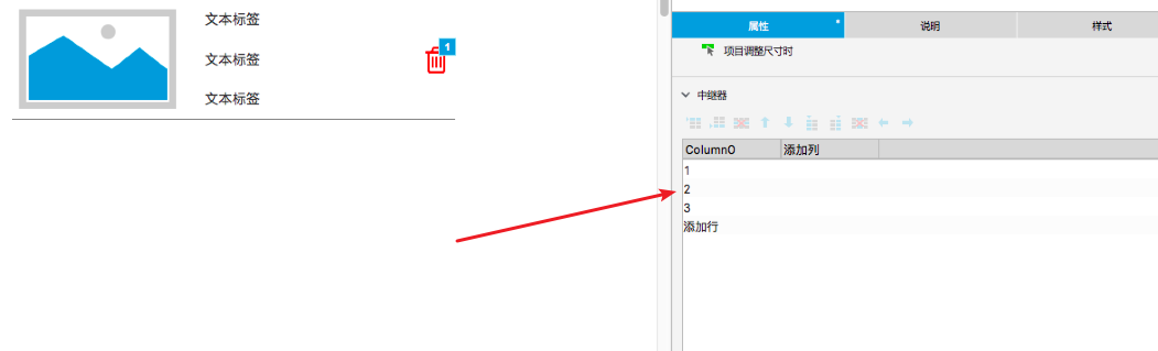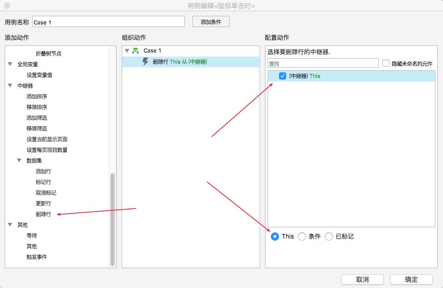 切换到中继器页面,选择删除图标,双击鼠标点击时,选择左侧中继器下的删除行,勾选默认的This。