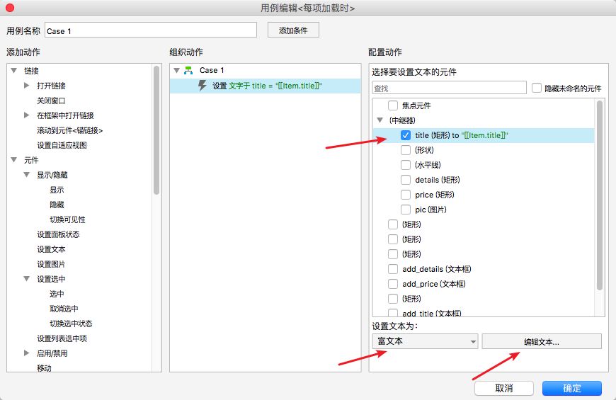 双击属性的Case1,勾线title,选择富文本,然后编辑文本为[[Item.title]]。对price和details做相同处理。完成以后,预览文件,即可看到页面默认静态效果。
