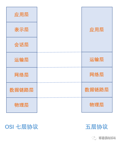 如上图所示,OSI 七层协议体系结构概念比较清楚,理论比较完整,但相应的也比较复杂和不够实用,而通过对其进行简化,得到五层协议体系结构,可以在简洁性和理论完整性之间取得一个折中。该五层协议的体系结构是我们最常讨论的体系结构,自然也是面试的一个重点。