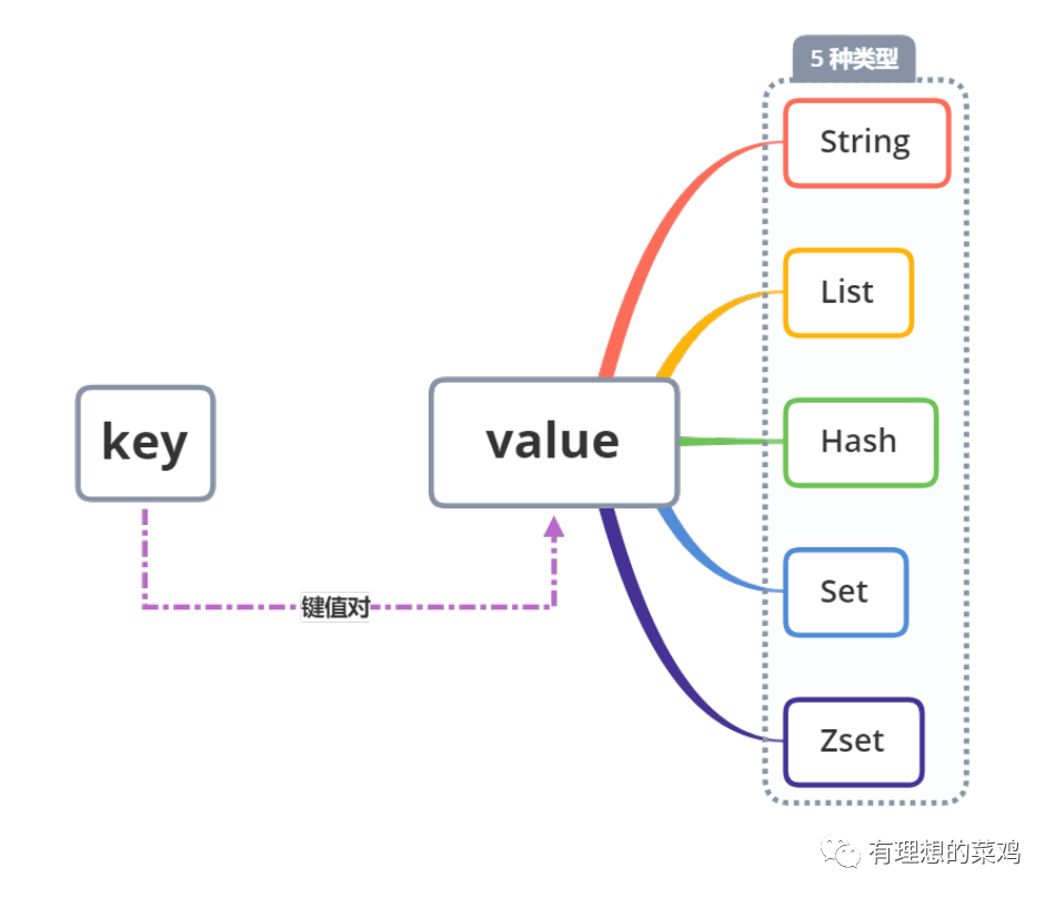 如下图所示,图中展示了 Redis 的 key-value 的存储结构和五种基本数据类型。