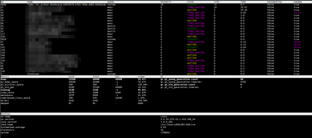 通过这部分信息,我们可以有针对性地进行 JVM 调优,当然,单纯查看 JVM 信息并不一定需要使用 Arthas。