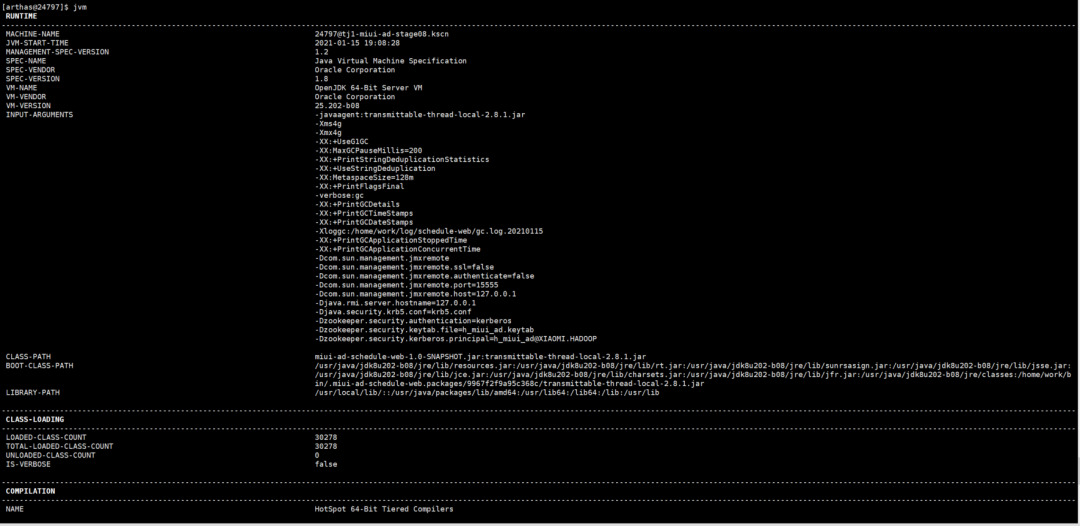 Arthas 还支持查看当前 JVM 的信息,通过简单的 jvm 命令就可以做到,部分内容截图如下所示: