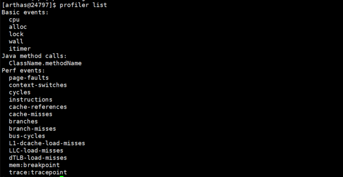 另外,值得一提的是,Arthas 还可以生成应用热点的火焰图。使用 profiler 命令,通过不断的采样,将收集到的采样结果生成火焰图。我们可以通过 profiler list命令来查看火焰图支持采样的事件: