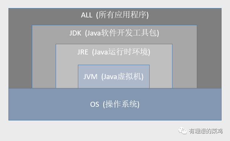 至于三者之间的关系,其实很简单。一句话总结:JDK包含JRE,JRE包含JVM。如下图所示: