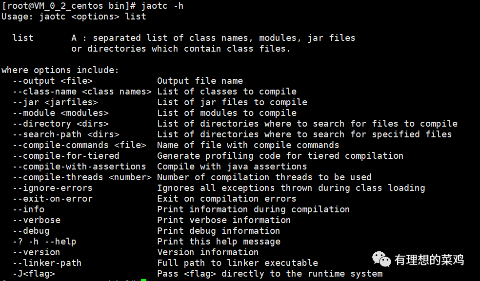 在了解了aot的基本功能之后,接下来,我们来看一下jaotc的具体操作。这个时候,就需要用到万能的help命令了!当面对一个不熟悉的工具,最简单有效的方式就是“求助”,我们通过jaotc -h命令,来看一下jaotc的官方阐述: