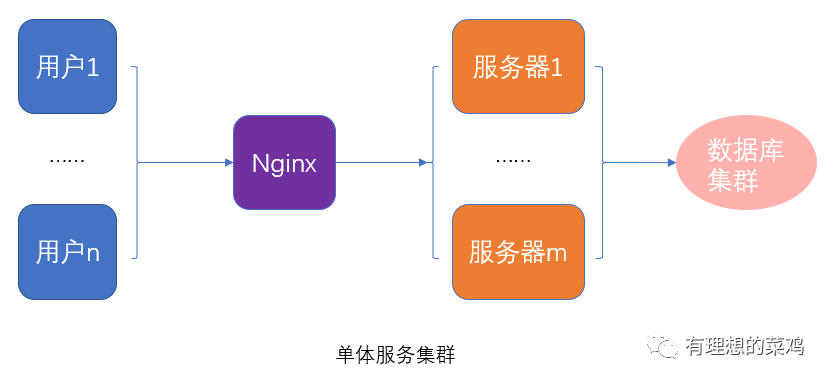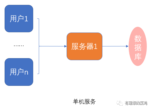 首先,在该项目刚刚上线时,由于用户较少,因此,服务的压力比较小,即便是部署在单台机器上,也能对用户的请求作正常的处理和应答(仅仅用作举例,一般在线服务至少要部署在两台机器上,防止单点问题)。此时,我们称该服务为单机服务。这种情况下,一般对数据库的要求也不高,即使单体也能够正常工作。这时候需要考虑的点比较简单,开发的重点是丰富业务功能,完善业务场景,优化使用体验。