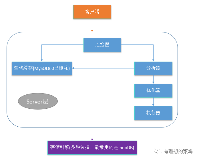 从图中可以看出,MySQL分为Server层和存储引擎层两部分。我们整体来看一下这张图中的内容:
