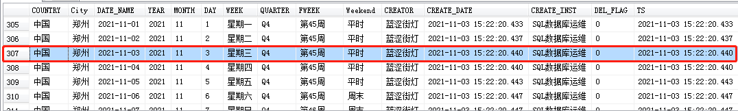CREATE TABLE RQ_TABLE(COUNTRY VARCHAR(5),--'国家'City VARCHAR(5) ,--'地市'DATE_NAME VARCHAR(20) ,--'日历日期'YEAR CHAR(4),--'年'MONTH CHAR(2),--'月'DAY CHAR(2),--'日'WEEK CHAR(6),--'星期'QUARTER varchar(2) NULL,--季度FWEEK varchar(6) NULL,--一年中的第几周,国外周日是一周的第一天,周六是最后一天Weekend varchar(20) NULL,--是否为周末CREATOR VARCHAR(32),--'创建人'CREATE_DATE DATETIME ,--'创建日期'CREATE_INST VARCHAR(20),--'创建公众号'DEL_FLAG CHAR(1) DEFAULT 0 ,--'删除标志' 0:不删除,1:已删除TS DATETIME DEFAULT GETDATE()--'时间戳')