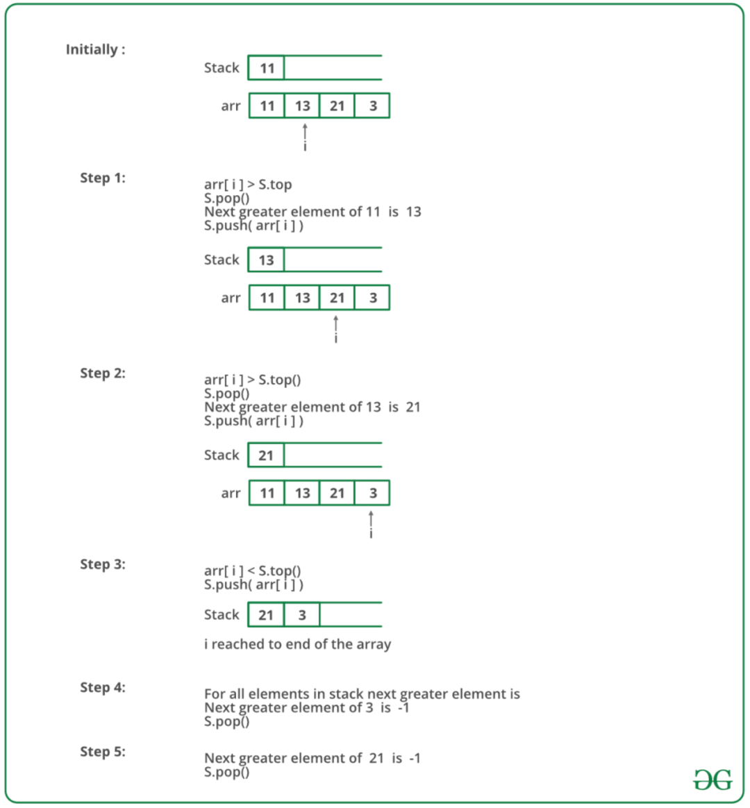 4.当弹出的元素小于next时,保持从栈弹出。next将成为所有此类弹出元素的下一个较大元素。