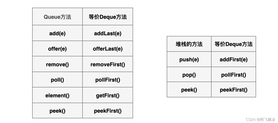 Deque接口扩展(继承)了 Queue 接口。在将双端队列用作队列时,将得到 FIFO(先进先出)行为。将元素添加到双端队列的末尾,从双端队列的开头移除元素。从 Queue 接口继承的方法完全等效于 Deque 方法