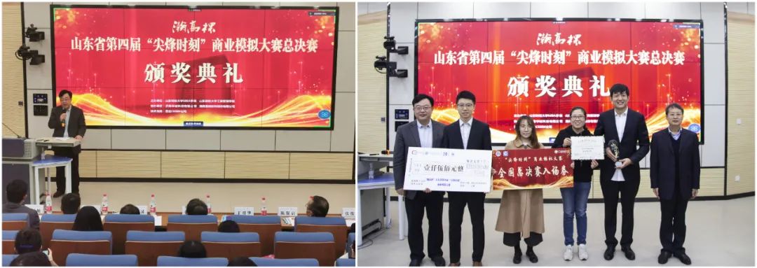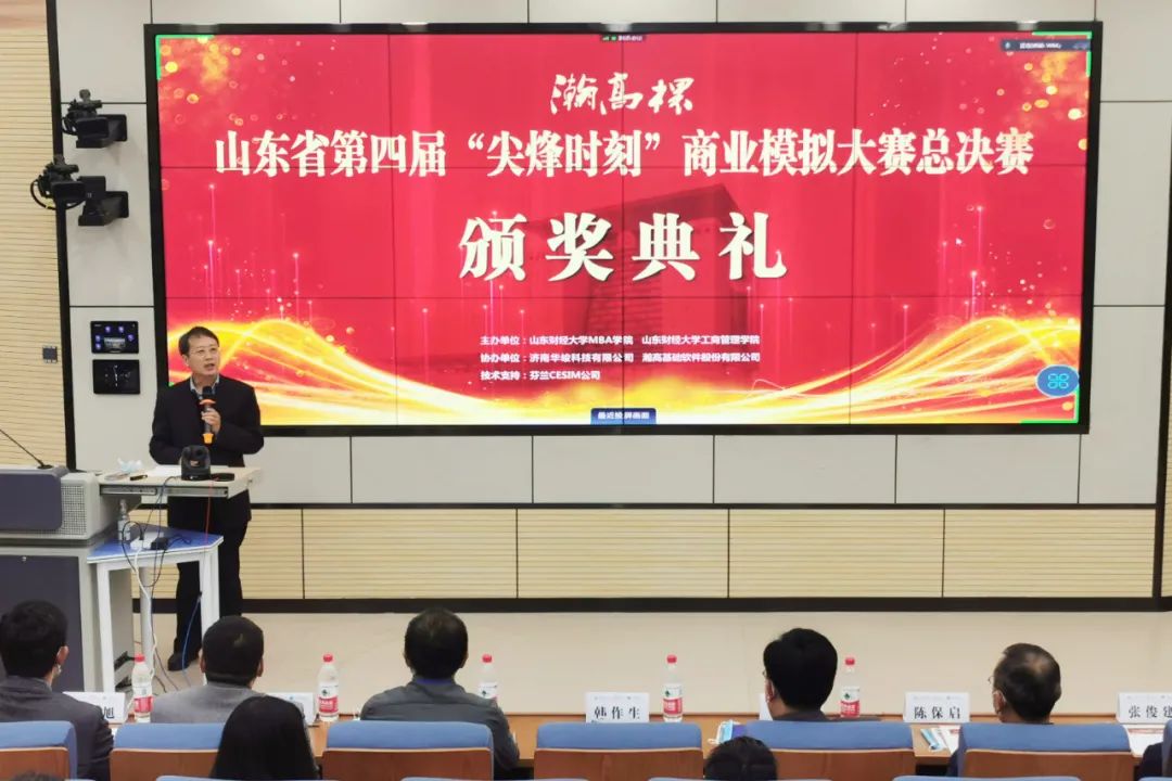山东财经大学副书记韩作生在颁奖典礼环节作发言讲话,韩书记首先对积极支持和响应此次总决赛的企业及学校表示感谢,并讲到山东财经大学MBA学院自成立以来,不断为社会输送优秀的商业管理者,此次决赛的冠名单位——瀚高公司的多位高管就来自山财大。在苗健董事长、丁召华总裁两位山财大MBA校友的带领下,瀚高现已发展成为国产数据库行业中占有率全国前三的龙头企业,成为破解我国基础软件领域“卡脖子”难题的一把关键钥匙。他强调,“尖烽时刻”作为一项全球性商业模拟赛事,希望通过此次实践,促进创新人才培养,助力高质量高等教育体系建设。