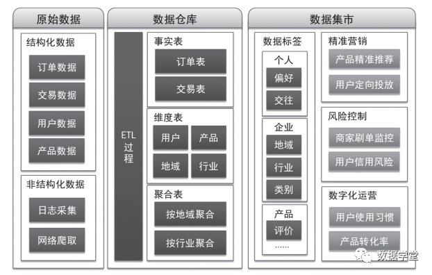 在开展对数据的各种分析应用之前,如果在数据仓库的基础上再开展一些数据标签的工作,提前做一些准备工作,那么后续对数据应用的设计开发将更加深入、更加便利,也更容易快速交付。整个数据中台的系统规划如下图所示。从这里可以看到,数据标签介于数据仓库与数据集市之间,在数据仓库之上,是为数据集市做的准备工作。