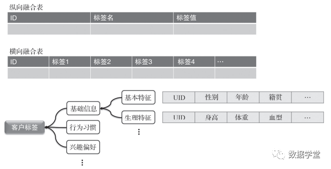 数据标签的设计首先从确定标签对象开始。数据标签是规划在数据集市这边的,就意味着它的设计与数据分析业务息息相关。真实的世界有那么多的事物,每个事物都有那么多的属性,因此漫无目的地打标签没有意义。给什么事物打什么样的标签,一定是与分析业务息息相关的。数据标签的对象可以是人(个人/群体)、事物与关系,比如用户、企业、订单、发票,以及开票行为、供销关系,等等。给什么对象打标签,关键在于我们对数据分析与应用的兴趣点,对哪些方面的事物感兴趣。譬如,要进行精准营销就要关注用户的购物喜好,要进行防虚开风控就要关注企业开票行为,等等。很多标签,特别是算法标签,都是通过比对某个对象方方面面的状况推算出来的。如何才能推算呢?就需要通过某些key值将该事物方方面面的属性关联起来。譬如,将用户通过订单与其购买的商品关联起来,然后又将哪些是婴儿用品关联起来,那么通过这些关联就可以推算某用户是否有了小孩;将企业所处的行业与地域关联起来,同时汇总各行业、各地区的平均水平,就可以推算该企业在本行业、在该地区的经济地位,等等。确定了标签对象,打通了对象关系,那么就正式进入标签设计环节。标签的设计首先按类目进行划分,把标签对象按照业务划分成多个不同的方面,接着再依次确认每个类目下都有哪些标签。通过以上分析,确定了数据标签的对象以及标签的类目,接着就是数据标签的设计实现。每个标签都有它的规则,通过一系列脚本定期生成。但数据标签设计实现的核心是标签融合表,即标签按照什么样的格式存储在数据库中。标签融合表的设计通常有两种形式:纵向融合表与横向融合表,如下图所示。