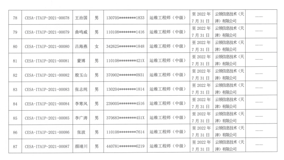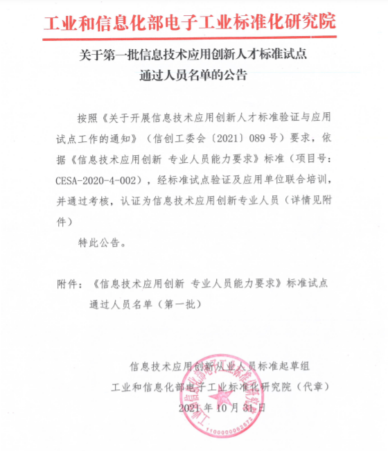 2021年10月31日,中国电子技术标准化研究院代表信息技术应用创新从业人员标准起草组(简称信创人员标准起草组)发布了第一批信息技术应用创新人才标准试点通过人员名单,在标准起草组官网(www.iits.cesi.cn)上同步发布公告。
