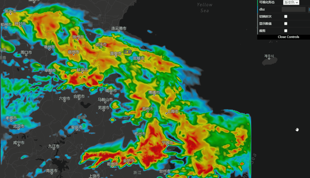 新的可视化框架基于WebGL开发,对格点数据的渲染做了大量符合业务要求的定制,输入一份灰度图数据,前端可以各种变换和动画,选择格网图层做个简单展示示例: