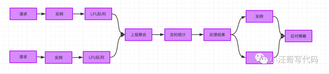 对于JVM本地存储,以对热key的处理为例进行说明。热key是指同一个设备号的曝光请求被媒体反复下发。在业务上线的初期,我们发现很多设备请求被下发很多次,有的每日可达上千万次,浪费了处理资源,需要某种策略进行应对。为此,我们设计了收集反馈的方式,具体流程:API实例本地LFU队列【LFU(Least Frequently Used) 算法根据数据的历史访问频率来淘汰数据,其核心思想是“如果数据过去被访问多次,那么将来被访问的频率也更高”。】收集 -> 上报 -> 统计 -> 反馈到API实例,如下图所示: