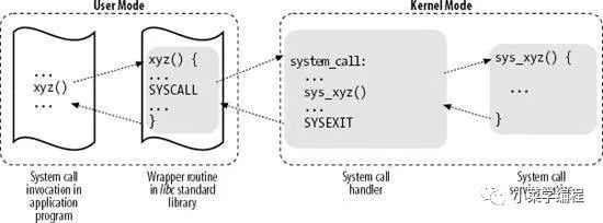 应用程序 ( application program )与 库函数 ( libc )之间, 系统调用处理函数 ( system call handler )与 系统调用服务例程 ( system call service routine )之间, 均是普通函数调用,应该不难理解。 而 库函数 与 系统调用处理函数 之间,由于涉及用户态与内核态的切换,要复杂一些。