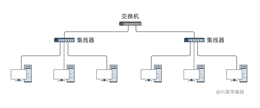 由于集线器无法隔离冲突域,因此现在已经很少用了,更不用说通过连接多个集线器来组网:
