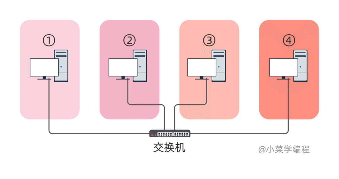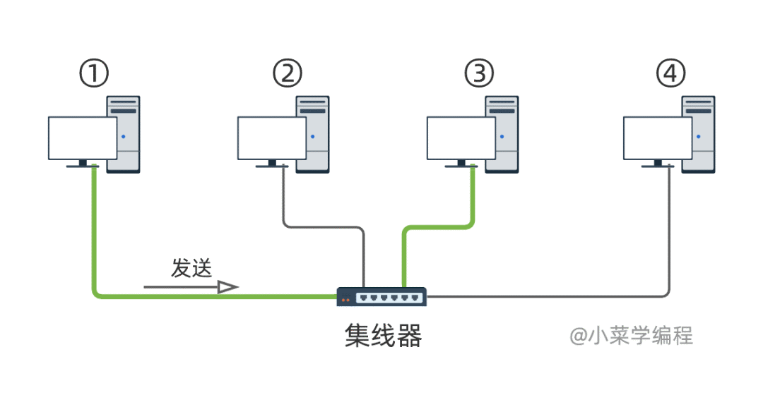 我们知道,集线器是一种很低级的物理层设备,本质可以理解成共用导线。因此,连接在集线器上的主机,不能同时通信。如下图,当主机①与主机③正在通信时,其他主机是无法通信的: