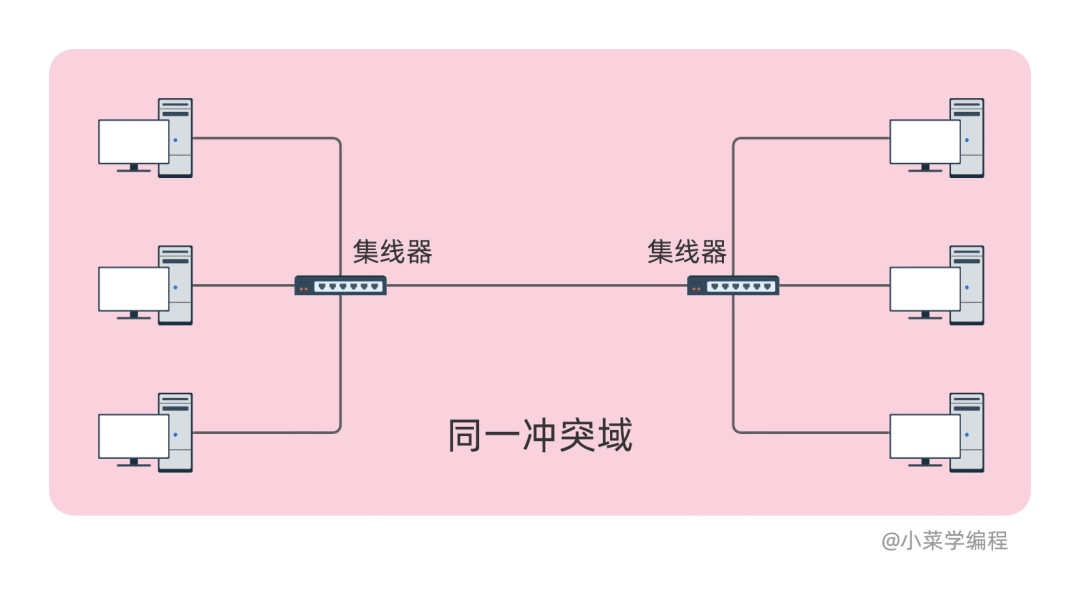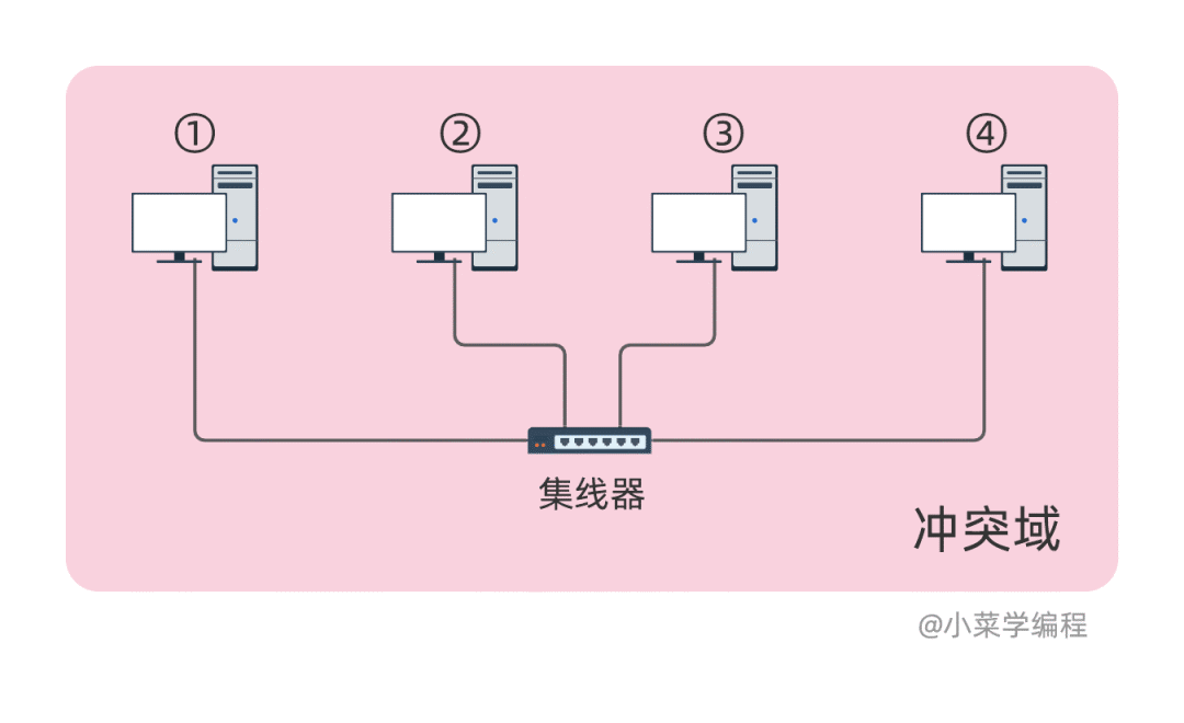 如果一个以太网域内,多台主机由于冲突而无法同时通信,那么它构成一个 冲突域 ( collision domain )。很显然,连接在同个集线器下的所有主机处于同一冲突域,它们的通信效率是非常低下的: