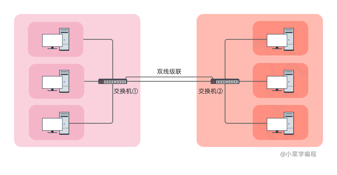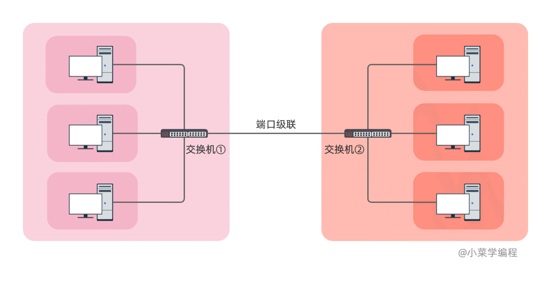 图中的两台交换机,各有一个端口通过网线连接起来。这样一来,左边主机与右边主机通信,都需要通过中间的这根网线,共用带宽。因此,在左边主机看来,右边主机都在一个冲突域内,左右两边通信效率较差。