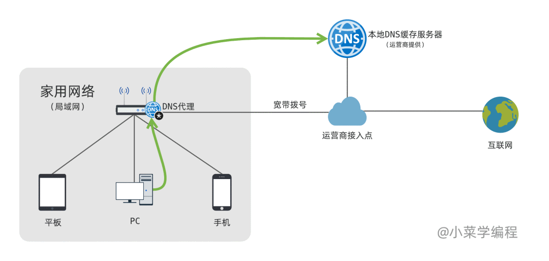 为实现局域网域名解析,路由器通常会提供 DNS 代理服务,接管整个网络的域名查询。路由器会告诉网络中的主机来找它解析域名;如果它收到本地域名解析请求,将直接返回结果;否则,它将进一步请求 DNS 缓存服务器。
