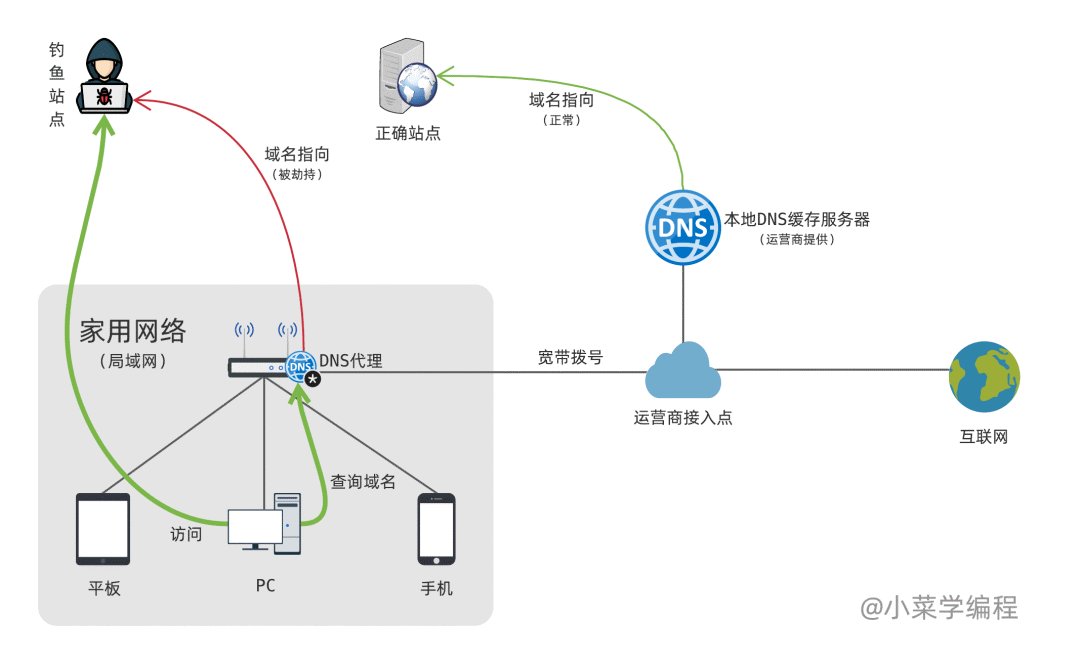 如上图,路由器被黑客攻破,它的 DNS 代理服务被黑客控制。黑客在 DNS 代理上做手脚,将某个网站的域名,指向自己精心布置的钓鱼站点。这样的话,依靠 DNS 代理查询域名的终端,将被强制劫持到钓鱼站点。