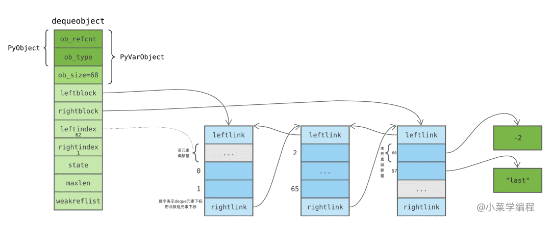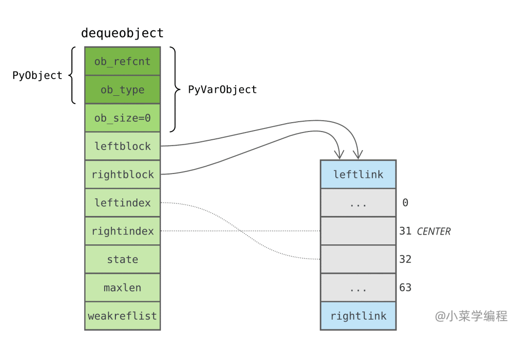 回到 deque 底层结构体 dequeobject ,它很显然是一个变长对象,包含变长对象公共字段 PyObject_VAR_HEAD 。除了公共头部,还包含 7 个字段:
