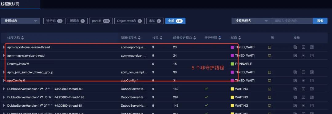 可以看到旧版 APM 里有 5 个非守护线程,其中 4 个非守护线程正是旧版 APM 内部的常驻线程。