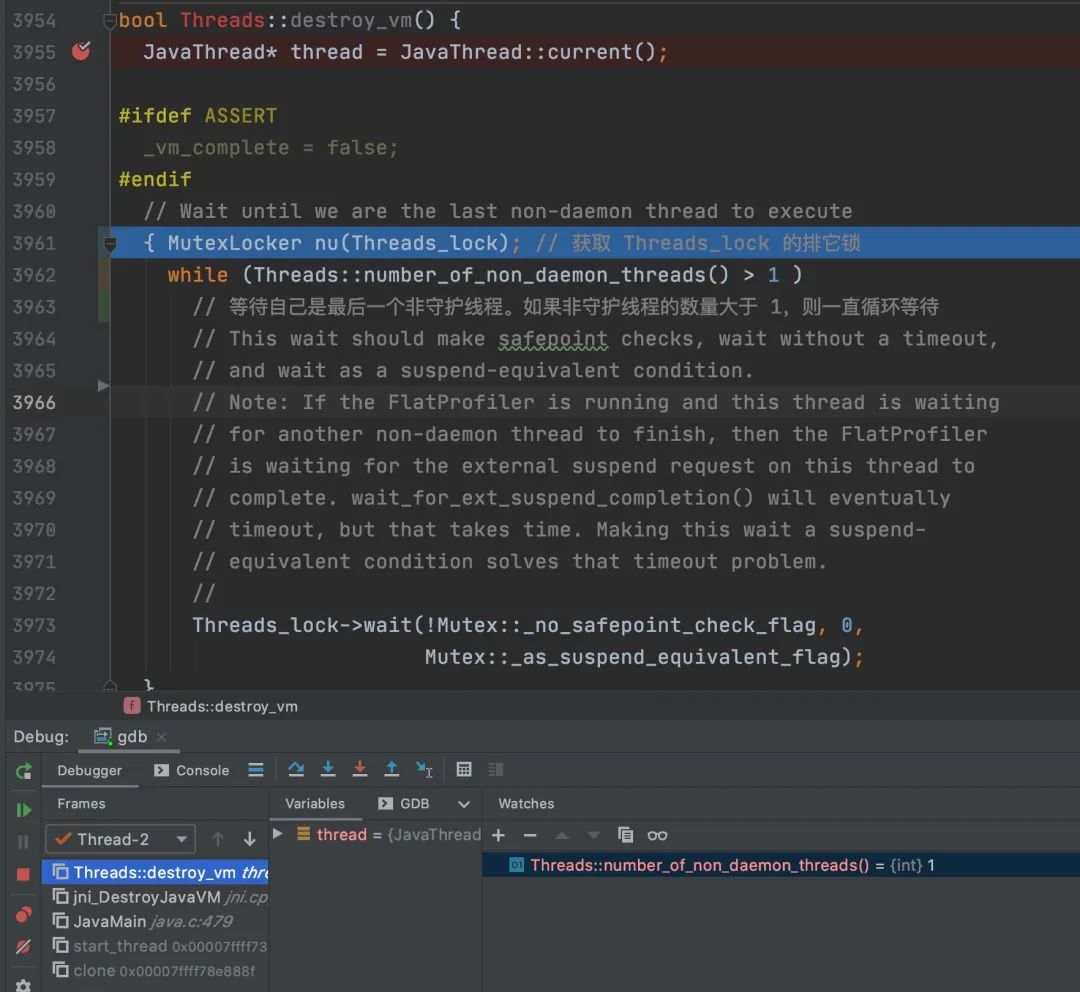 可以看到,JVM 会一直等待 main 线程成为最后一个要退出的非守护线程,否则也没有退出的必要。这使用了一个 while 循环等待条件的发生。如果自己是最后一个,就可以准备整个 JVM 的退出了。