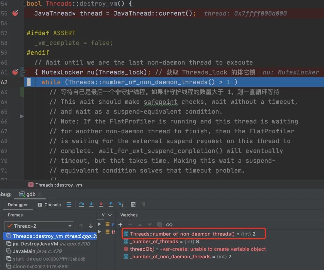 这个例子中,main 函数退出时,会进入 destroy_vm 方法,在这个方法中,会 while 循环等待自己是最后一个非守护线程。如果非守护线程的数量大于 1,则一直阻塞等待,JVM 不会退出,如下所示。