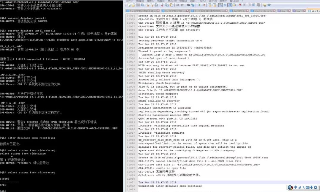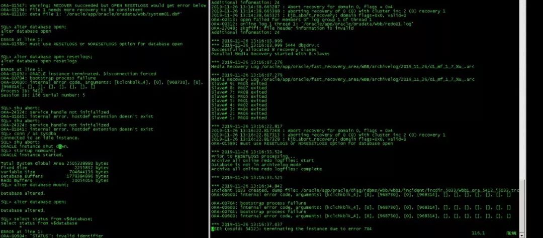 ORA-01547: 警告: RECOVER 成功但 OPEN RESETLOGS 将出现如下错误