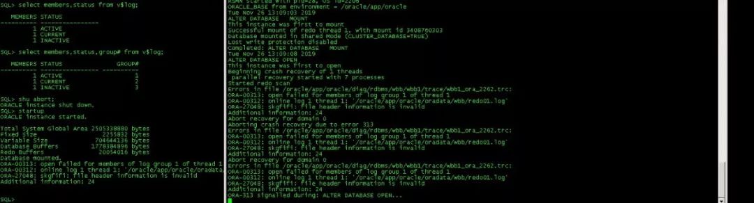 手工将redo文件破坏.将redo文件部分内容删除模仿文件损坏.启动库的时候看到报错,此时active状态的redo日志文件已不能被数据库使用。
